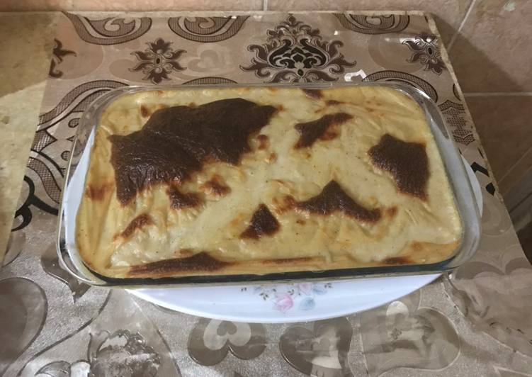 - وفوقها البشاميل وممكن معها مودزاريلا رشة ع الوجه وتدخل الفرن حوالي ١٠دقايق وبالهنا.