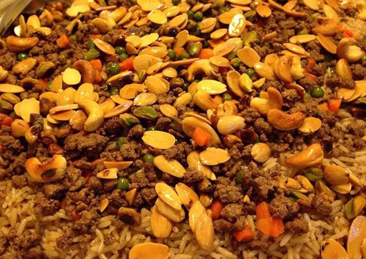 - نضع الارز بوعاء التقديم ونضيف عليه البازيلا والجزر واللحمه والمكسرات وبجانبه بكون فخده خروف او دجاج مشوي والف صحة.